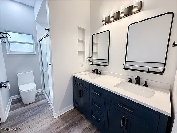 Beautifully renovated spacious corner two bedroom, two full bath condo located on first floor. Upgrades include New luxury vinyl flooring, fresh paint, new fixtures, quartz countertops, S/S appliances, Artika acoustic panels, designer lighting, all new piping. Perfect condo as your first home, winter getaway or a great investment property. Amenities include a 9-hole Golf course, PICKLEBALL, two pools, a clubhouse, library, billiards, basketball, plus much more. Great location near Coconut Point Mall, Miromar Outlets, Hertz Arena, Florida Gulf Coast University and close to SW Regional Airport. Priced to Sell! Lowest priced 2/2 in the Greens. Water/sewage are included in your HOA fees. Two pets are allowed with approval.